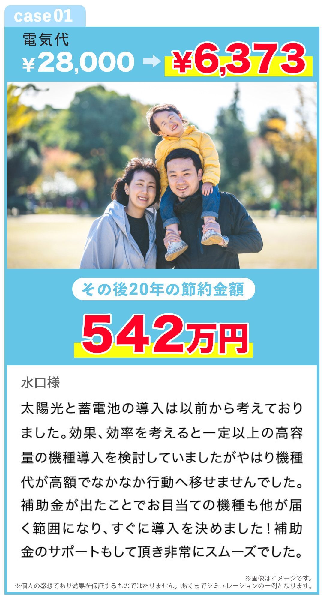 ※導入例 太陽光容量7.0kWh,蓄電池容量 14.9kWh,平均月間発電量 610kWh想定, 自家消費割合90%想定,売電単価16円/kWh 導入前:基本料金1559円 電気量料金(使用量 703kWh) 26445円 計 28004円 導入後:基本料金1559円 電気量料金(使用量154kWh)4814円 計6373円で算出 機器代337.5万円