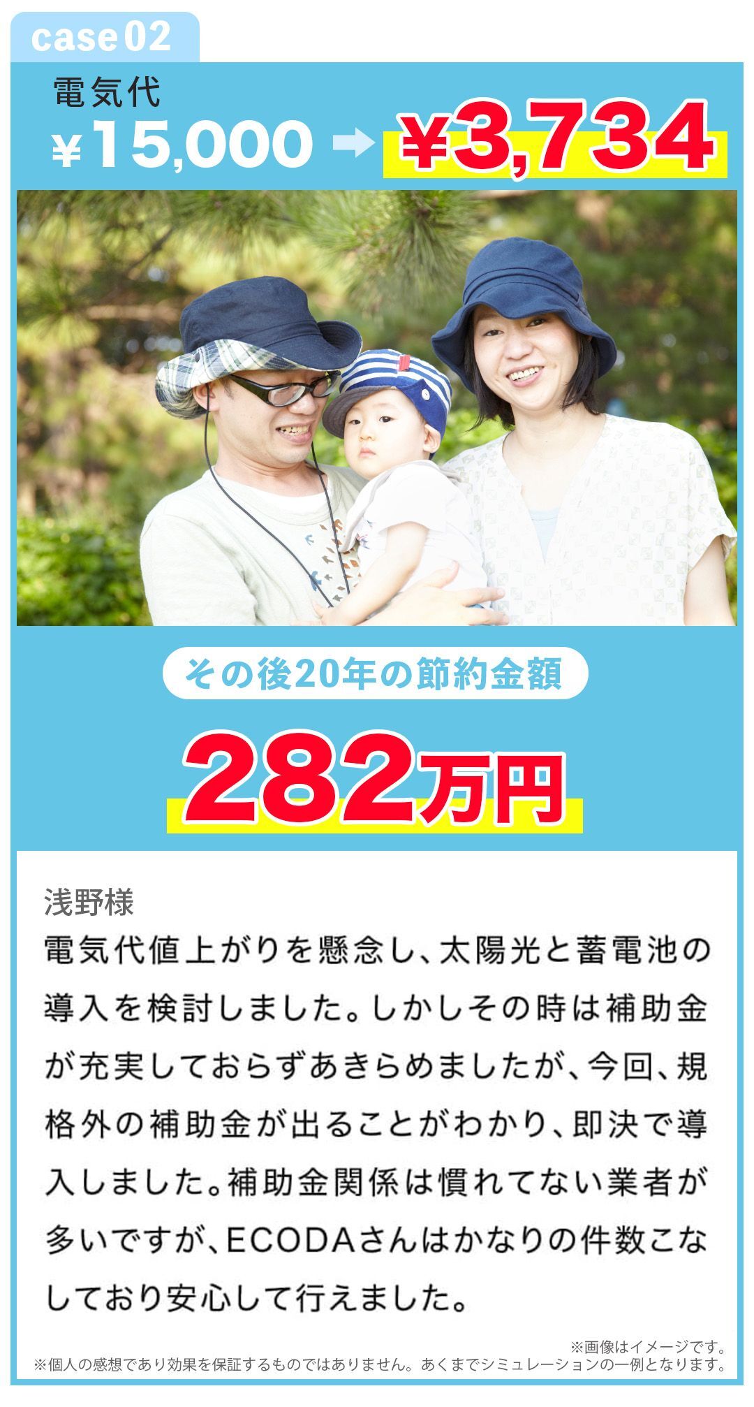 ※導入例 太陽光容量3.75kWh,蓄電池容量 7.4kWh,平均月間発電量 343kWh想定, 自家消費割合90%想定,売電単価16円/kWh 導入前:基本料金1559円 電気量料金(使用量 382kWh) 13,448円 計 15,007円 導入後:基本料金1559円 電気量料金(使用量73kWh) 2,175円 計 3,734円で算出 機器代212.3万円